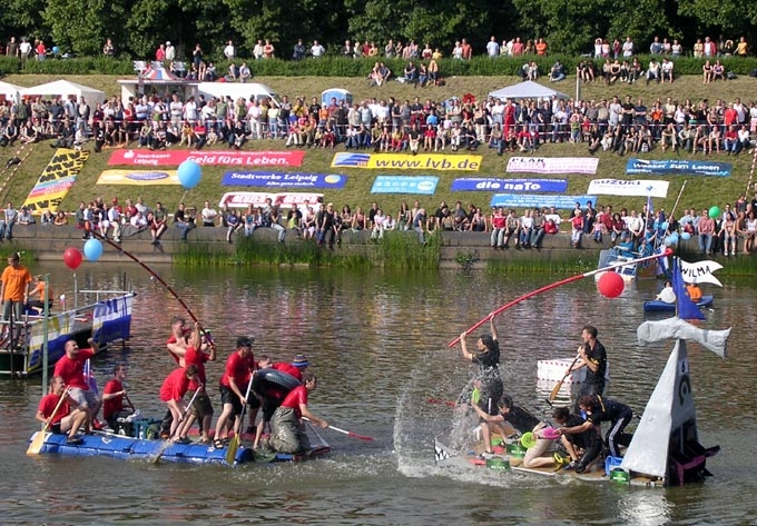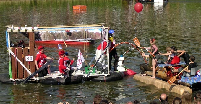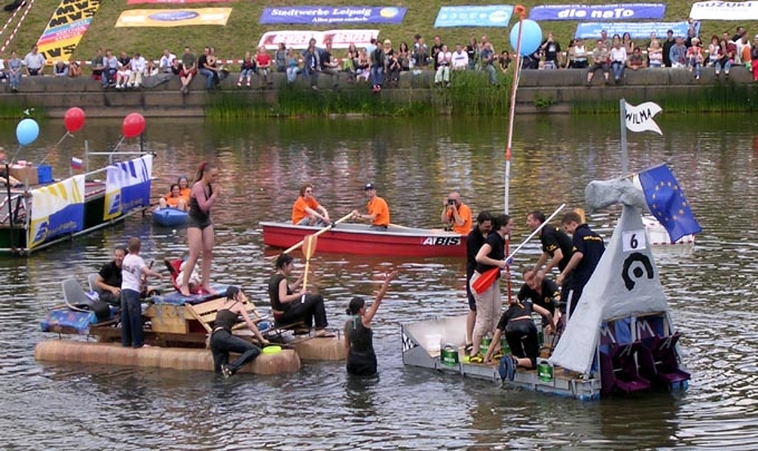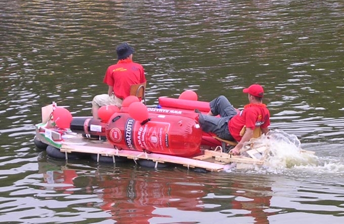... Minuten später hatten ihnen die »Old Indians« (Indien) gezeigt, wo der Hammer hängt. Die »Old Indians« gewannen mit mehrfachen ungewollten Abgängen ins Wasser, bei denen sie aber immer eine elegante Haltung bewahrten, auch den erstmals ausgelobten »tapir-Sonderpreis im Sachgebiet zukunftsweisender Unterwassererotik« (Man beachte die auf 1000jähriger Wikinger-Seefahrttradition basierende »Barbarossas barbarische Rabarber Barbaren« (Schweden) im Hintergrund.)